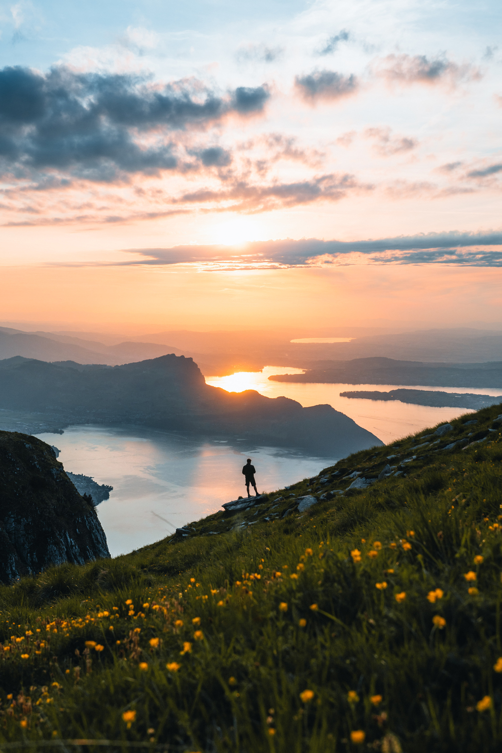 Witness the striking Swiss sunset, cloaking the mountains in shades of warm yellow and orange, while revealing a serene lake view. A tranquil and awe-inspiring moment capturing the beauty of Swiss nature.